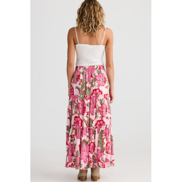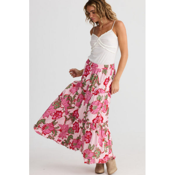 This maxi beauty features a comfortable elastic waist that moves with you, paired with beautifully tiered gathered layers that create gorgeous volume and dimension.  Delicate frill details add a touch of whimsy to the hem, while the full length offers that coveted flowing silhouette.