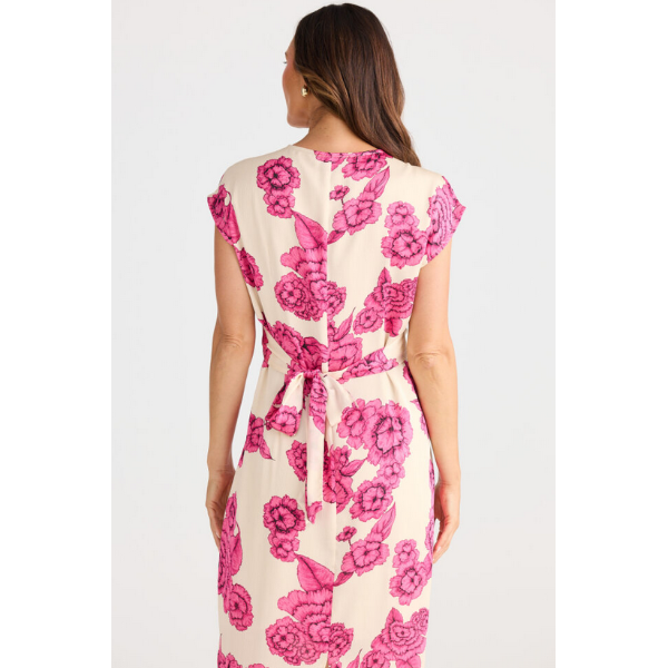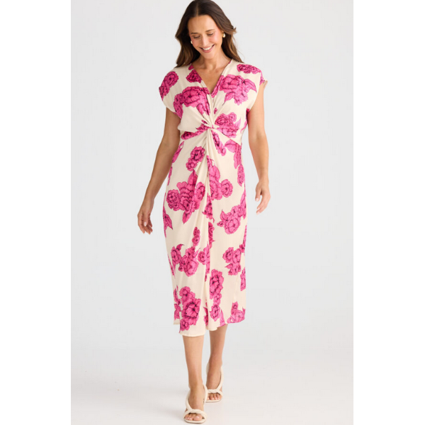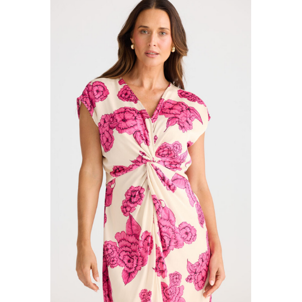 The Lorenzo Dress brings a playful twist to classic elegance with its charming V-neckline and eye-catching twist knot front detail.