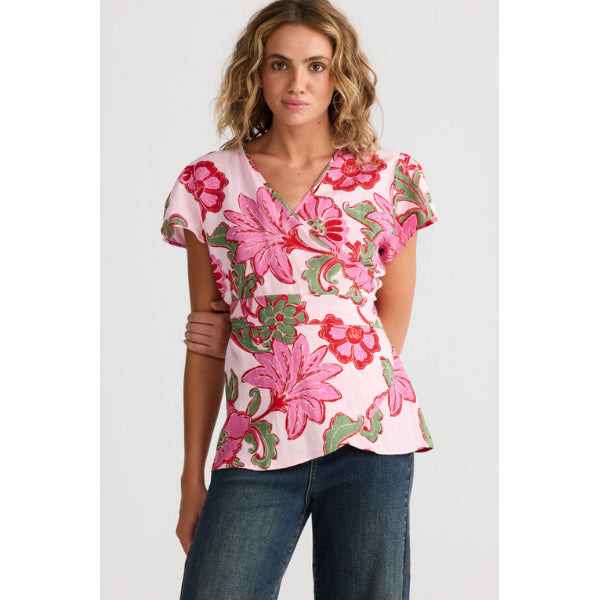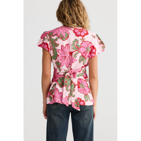 This playful piece features a flattering V neckline that elongates the silhouette, while gathered cap sleeves add a touch of vintage charm.